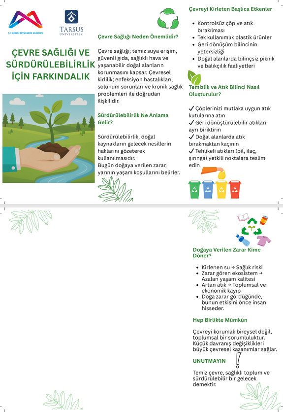Etkinlik süresince çevrede bulunan vatandaşlara çevre sağlığı ve sürdürülebilirlik konularında bilgilendirici broşürler dağıtılarak farkındalık çalışmaları yürütüldü. Ayrıca sembolik olarak üniversite adına TEMA Vakfı’na 10 fidan bağışı yapılarak çevresel sürdürülebilirliğe kalıcı katkı sağlandı.