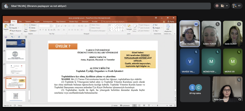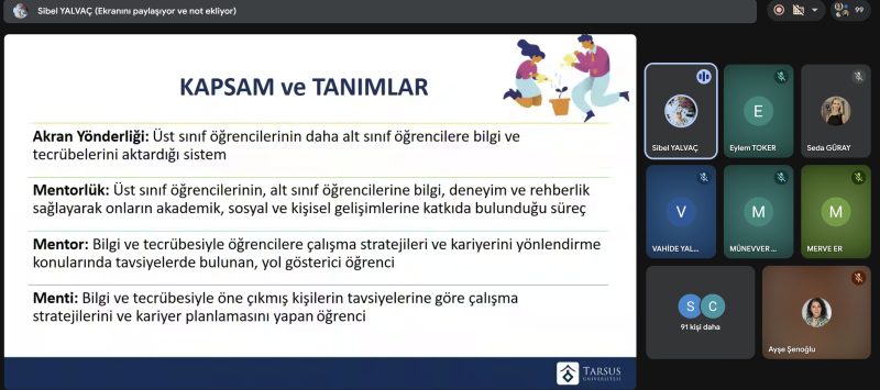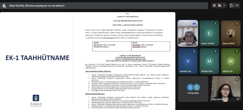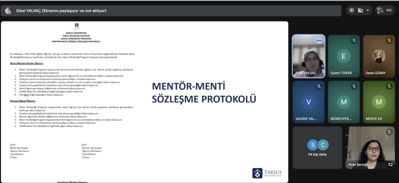 Eğitimde öğrencilerimize, menti ve mentor kavramlarının tanımları ve akran yönderliği programının amaçları, süreç boyunca menti ve mentorün görev ve sorumlulukları ile ilgili bilgilendirmeler yapıldı. Ardından Bölüm Başkanımızın danışman olduğu Tarsus Ebelik ve Sağlık Öğrenci Topluluğu ile ilgili paylaşımlarda bulunuldu.