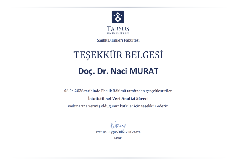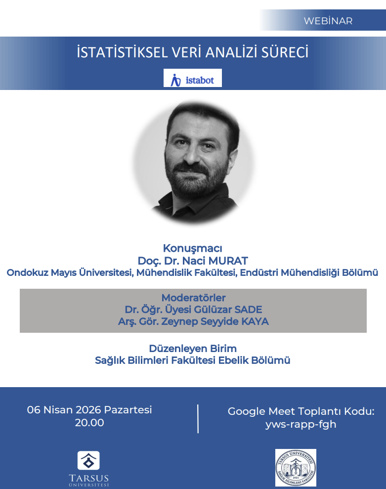 Tarsus Üniversitesi Sağlık Bilimleri Fakültesi Ebelik Bölümü tarafından 06 Nisan 2026 tarihinde “İstatistiksel Veri Analizi Süreci” başlıklı çevrim içi webinar düzenlendi.