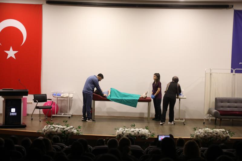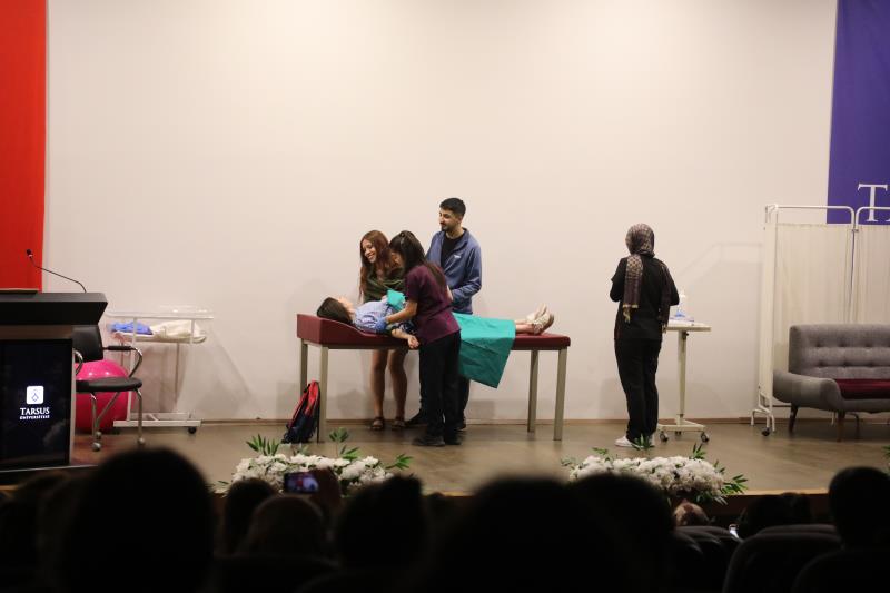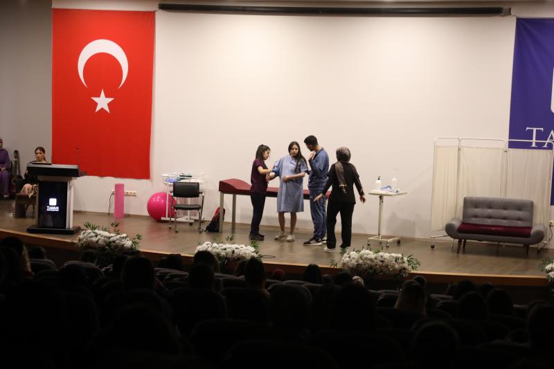 Açılış konuşmalarının ardından program, senaryosu Dr. Öğr. Üyesi Ayşe Şenoğlu, Arş. Gör. Zeynep Seyyide Kaya ve Ebelik Bölümü öğrencileri tarafından hazırlanan ve yönetilen “Bir Ebenin Dokunuşu” adlı tiyatro gösterisi ile devam etti. Öğrencilerin yazıp sahneledikleri oyun, ebeliğin yalnızca klinik bir meslek olmadığını; aynı zamanda kadına, aileye ve topluma dokunan yönünü etkili bir biçimde ortaya koydu. Doğum sürecinde ebenin rolü, iletişim becerileri ve mesleki sorumlulukları sahne performansı ile izleyicilere aktarılarak ebeliğin önemi vurgulandı.